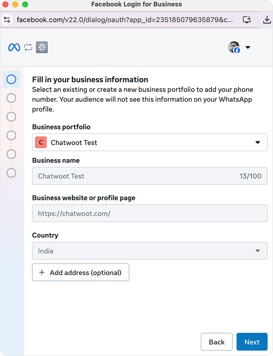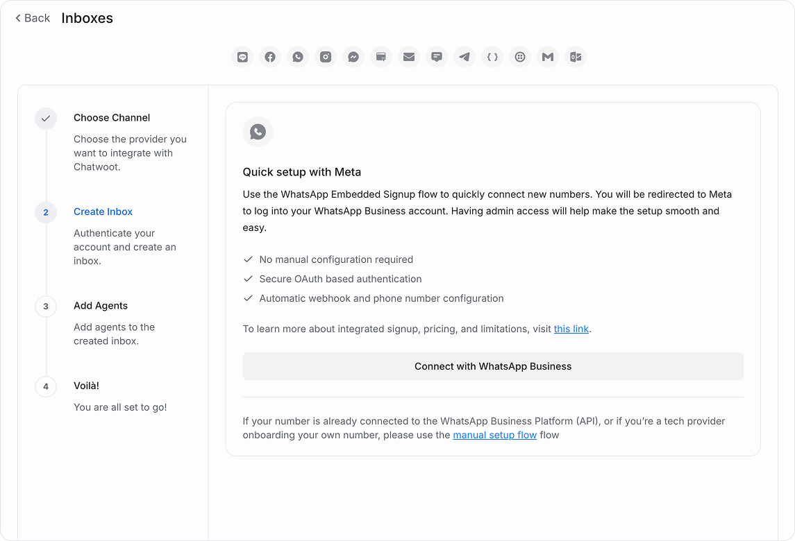 The Embedded Signup is a browser-based interface by Meta that authenticates your Facebook user, links your WhatsApp Business Account (WABA), and adds a phone number in a single flow. Unichat uses this to eliminate the need for manual tokens or webhook configurations.